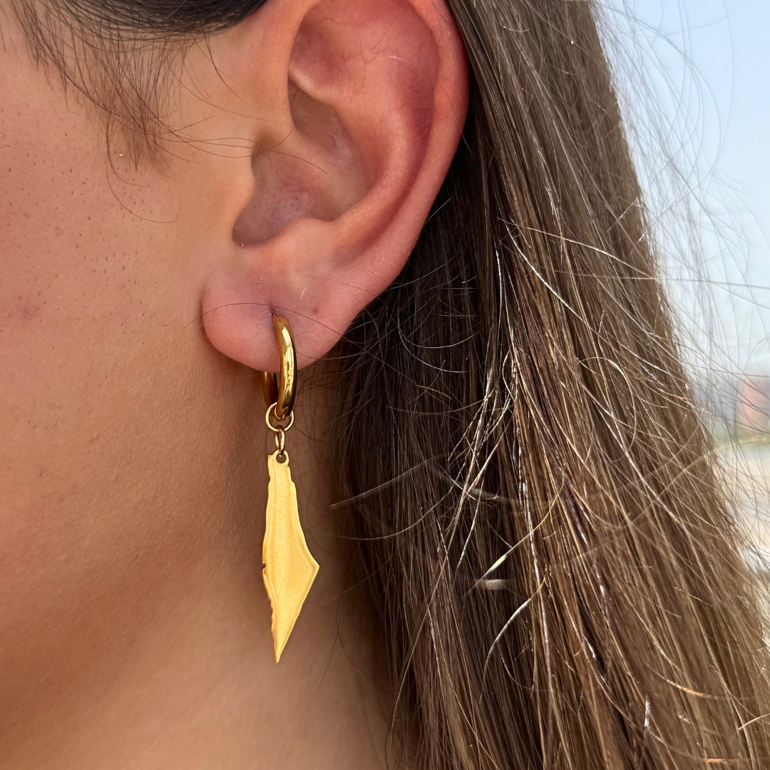 a bold yet elegant tribute to home. These 18k gold-plated stainless steel earrings feature a beautifully crafted charm in the shape of Palestine. Thoughtfully designed in everyday wear, they're tarnish free, water resistant and full of meaning.
