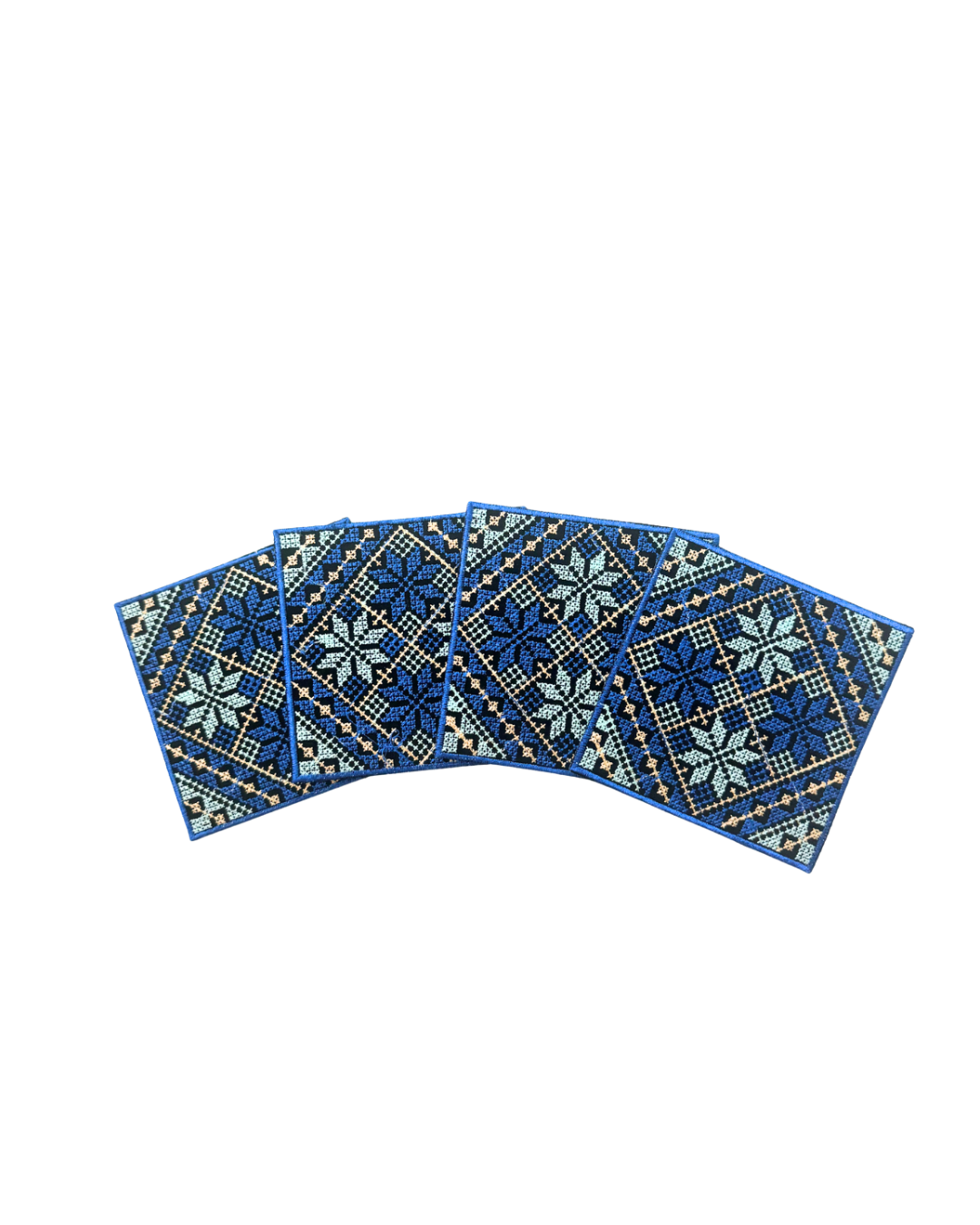 This elegant set of six dark blue Tatreez coasters features the Moon of Bethlehem, a symbol of beauty and heritage. Perfect for protecting your surfaces while enjoying a warm cup of tea, these coasters add a touch of Palestinian culture to any space. Durable, stylish, and meaningful.