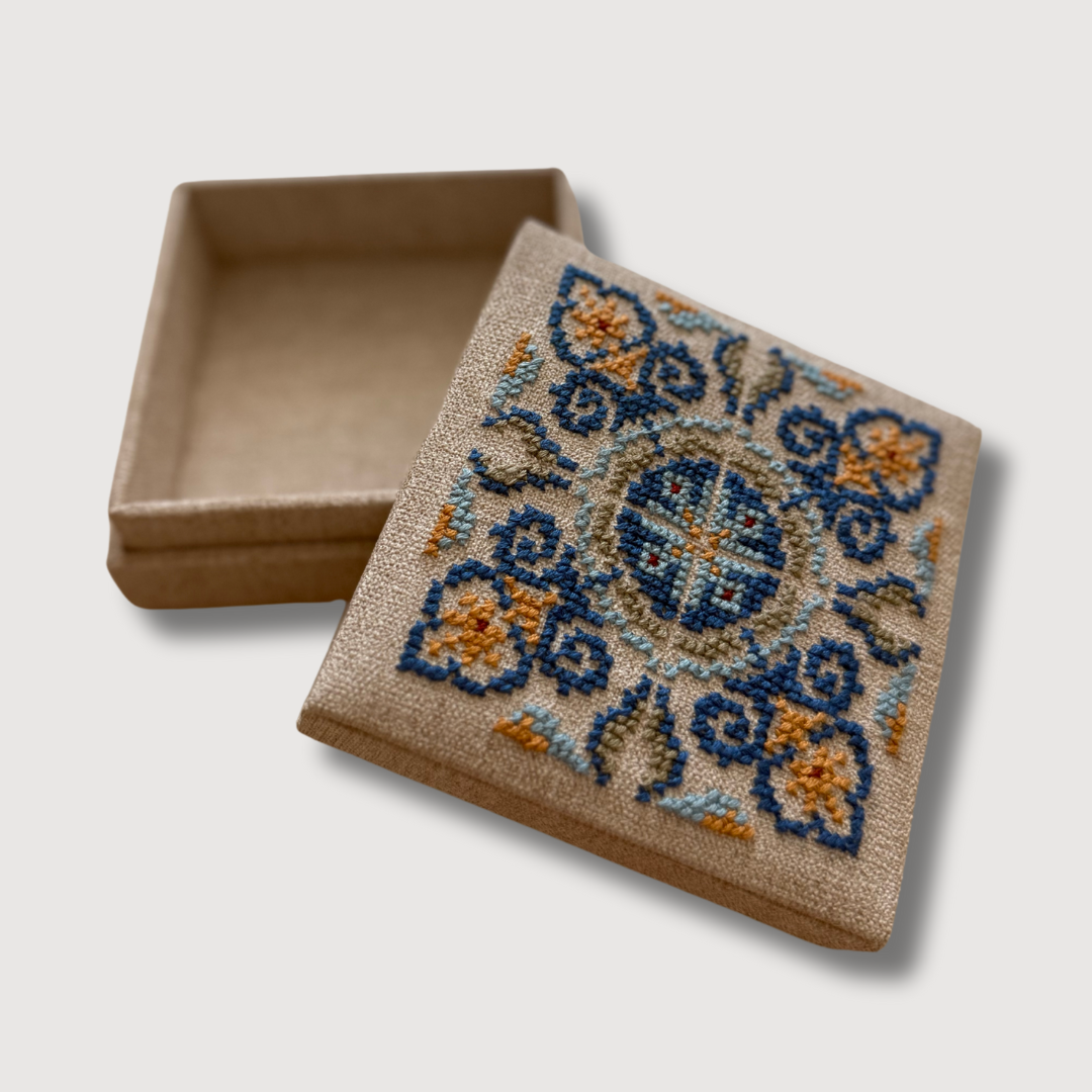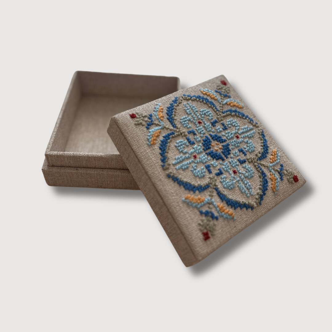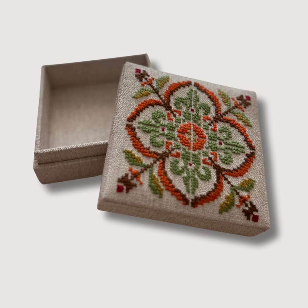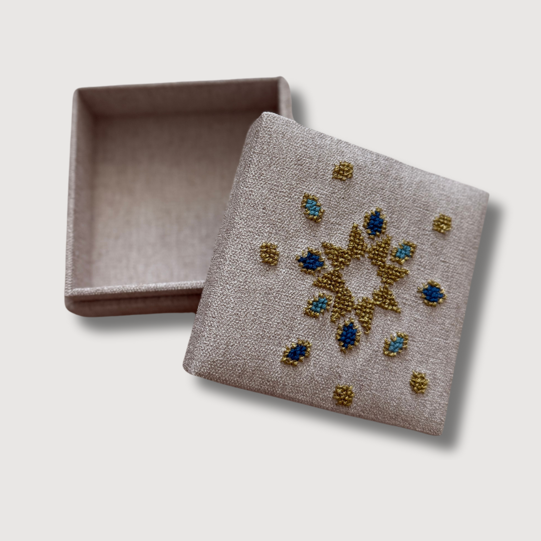 Small in size, rich in story. These Arabesque Handmade Tatreez Mini Gift Boxes are adorned with intricate, symmetrical motifs inspired by the timeless elegance of Arabesque design — echoing the geometry of historic Palestinian tiles and architecture.