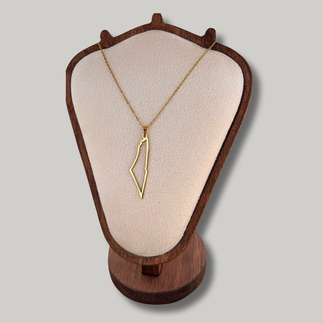 Carry Palestine close to your heart with the Map of Palestine Necklace. A delicate yet powerful outline of our homeland. Made from high quality 18 gold plated stainless steel, this piece is tarnish free and designed to last.
