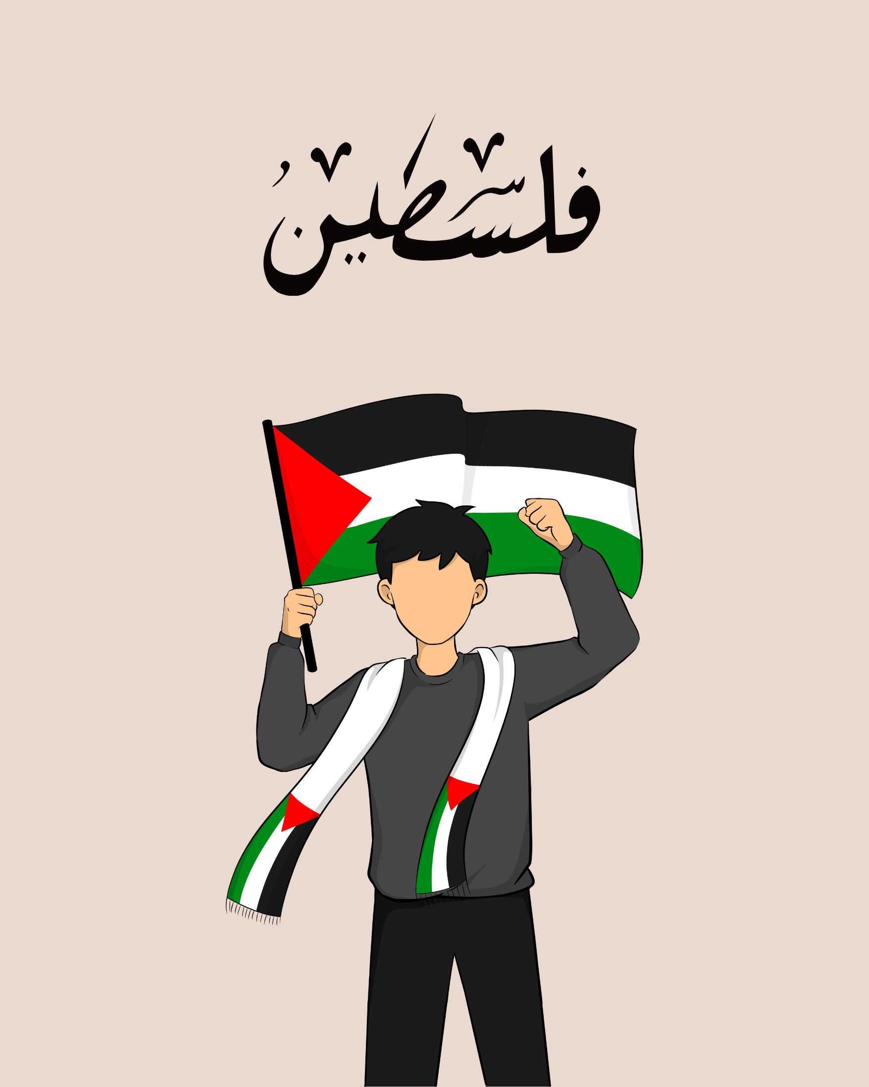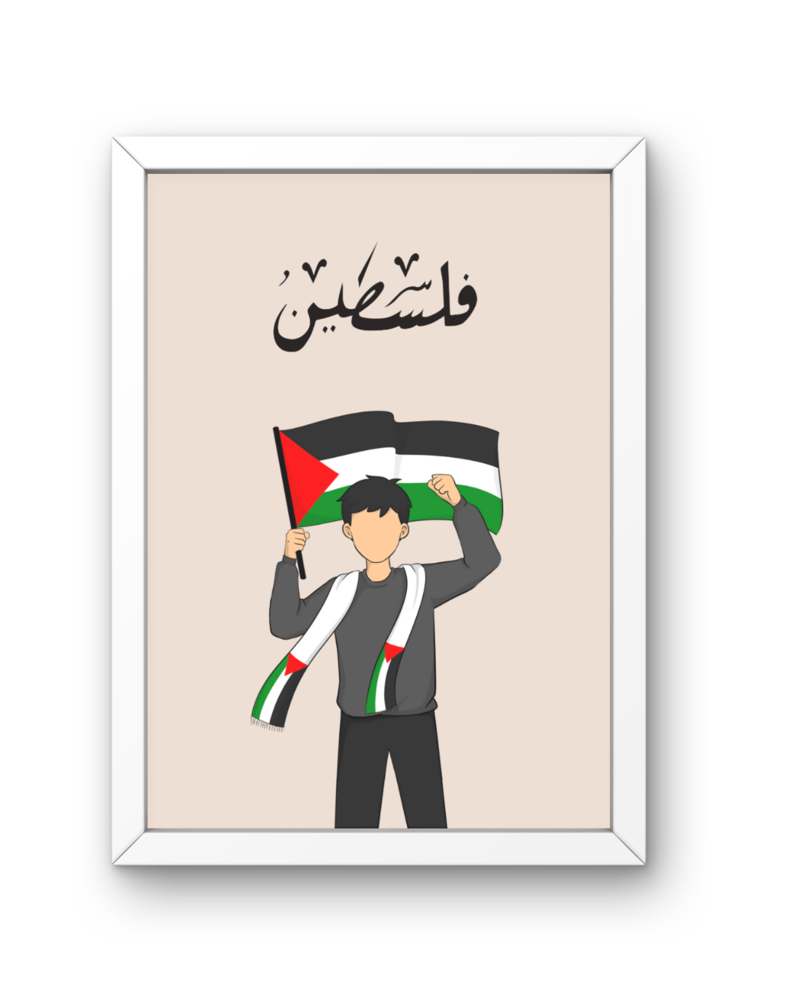 This powerful artwork features a young Palestinian boy raising the flag with pride, his hand forming a peace sign—a message of resilience, strength, and unwavering hope. A tribute to the spirit of Palestine, past, present, and future.