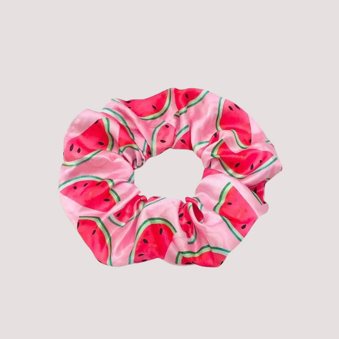 A playful twist on a powerful symbol, this satin finish scrunchie features vibrant watermelon slices, a nod to the colors of the Palestinian flag and a quiet symbol of resistance.