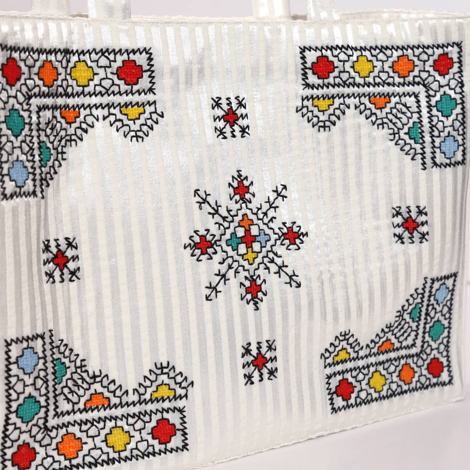 Inspired by the elegance of traditional Arabesque design, this handmade Tatreez tote bag features intricate geometric and floral embroidery on rich striped sayeh fabric. Each motif is carefully stitched by hand, echoing the ornamental patterns found in Palestinian architecture and heritage textiles.